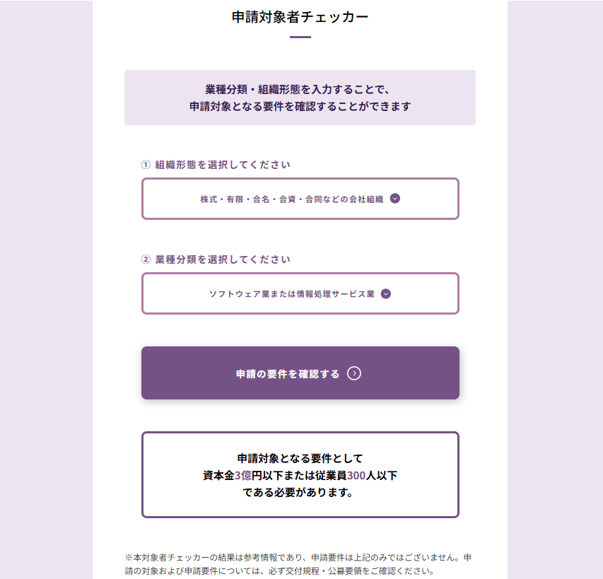 組織形態と業種分類を入力するだけで、自社の申請要件を確認することができるので、ご活用ください。